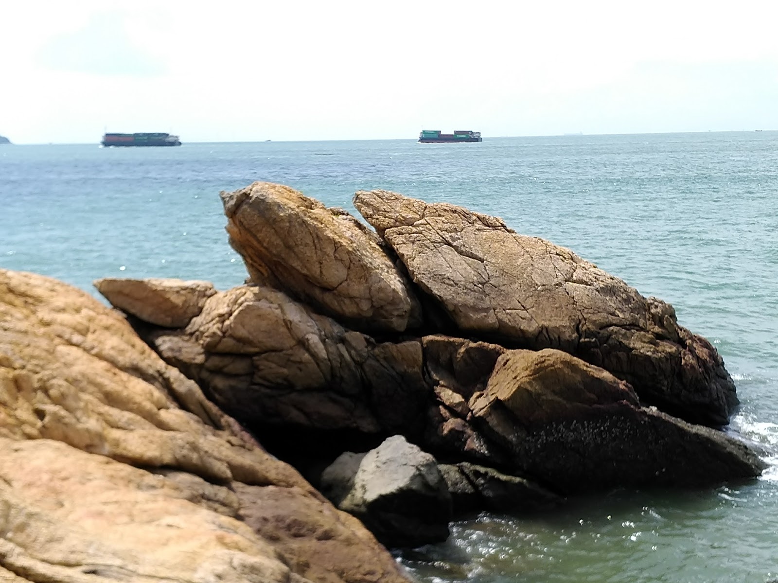 這個入口真十分難才可發現,你要在海事處建築物的鐵網旁細心觀察才可找到蛛絲馬跡。到初步入不成徑,下了一會少了雜草,便可發現人為的布帶了,漸見徑跡。沿此先下行一大段,至一稍平密林坡,你會不見徑跡。要再小心偏右,就可找到布帶的指引,繼續下行,但荒草愈多,灌木及長草愈密。走至尾段聽到海浪聲,知道已近海邊,但奇怪是徑不成徑了,而是踏着石卵,再是大石,又濕又滑,竟發現自己涉溪而下。最後走出密林,終於見到大海。走到海邊的礁石上,似一隻海馬。但其實這兒仍不是爛角咀,應再向左方多走一百步,就是今天的目的地——爛角咀。